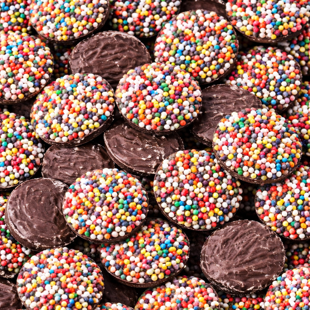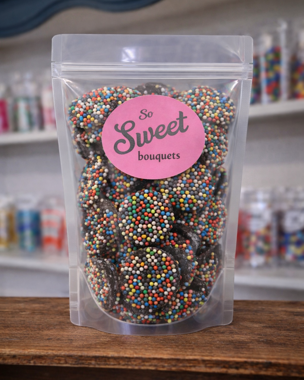 Add a colourful burst of fun to your candy collection with Rainbow Buds! These delightful treats are milk chocolate discs covered in vibrant, multi-coloured candy sprinkles, creating a perfect balance of rich chocolate and sweet crunch. With their playful appearance and irresistible flavour, Rainbow Buds are a perfect snack for sharing, gifting, or enjoying all to yourself. Whether you're looking for a nostalgic treat or something fun and festive, Rainbow Buds are sure to bring a smile to your face with every bite!